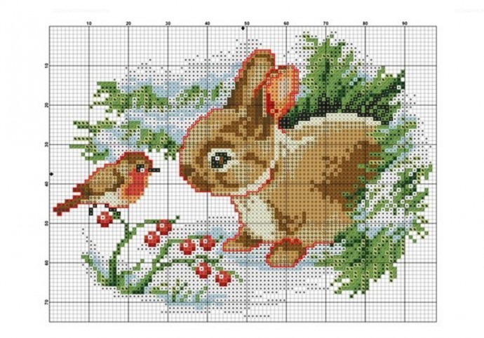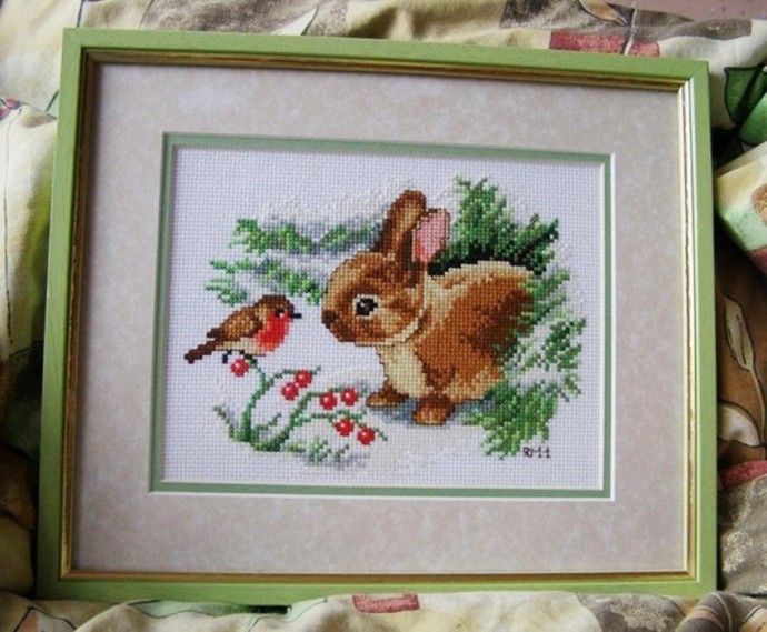 Вышивка "Зайчонок в снегу перед птичкой" будет чудесно смотреться в детской комнате.