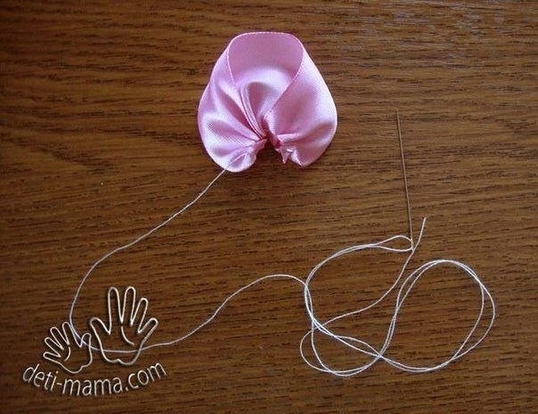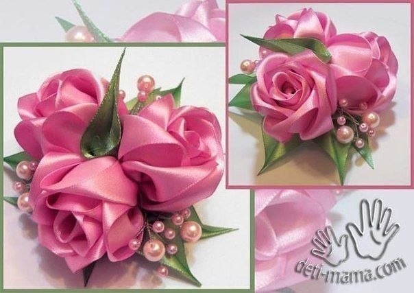 Розы из атласных лент дополнены бусинами из искусственного жемчуга на скрученной проволоке.