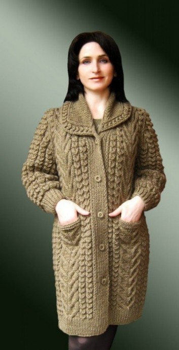 Обхват бедер — 104 см. Длина изделия — 87 см. Потребуется около 1700 г объемной акриловой или полушерстяной пряжи, спицы №3,5 — 4, пуговицы (или пластмассовые кольца для ручного изготовления пуговиц).
