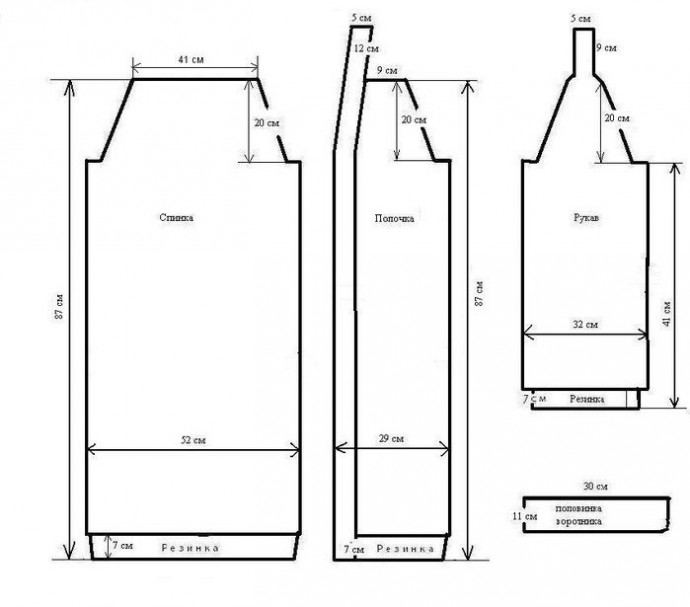 Набрать 89 п.и связать для планки 7 см резинкой 1х1. Для более точного расчета количества петель, необходимых для набора на спицы, воспользуйтесь «Правилом расчета количества петель». Узор вязать следующим образом: 1 п. кром., 15 п. узором «Зубчики», 17 п. узором «Коса», 23 п. узором «Зубчики», 17 п. узором «Коса», 15 п.узором «Зубчики». Последняя п. кром. Должно получиться 89 п. Провязав 33 узора «Зубчики» в высоту (67 см от наборного края), закрыть для проймы 1х6 п. с обеих сторон. Затем дважды через каждые 3 узора «Зубчиков» в высоту провязывать по 3 п. вместе с обеих сторон спинки (лиц. или изн. по узору) в начале ряда после кром.п., в конце ряда перед кром.п. Далее вязать без убавлений оставшиеся п. Через 11 узоров «Зубчики» в высоту (20 см) от начала скосов пройм закрыть все п., провязывая вместе поочередно по 2 п и по 3 п.
