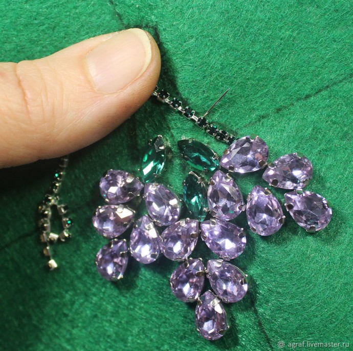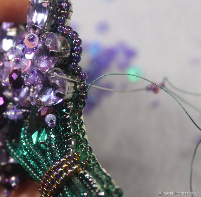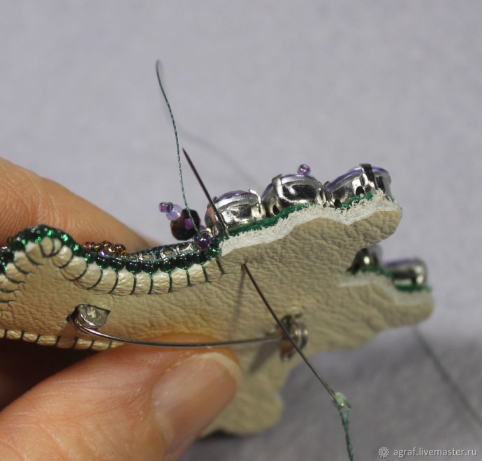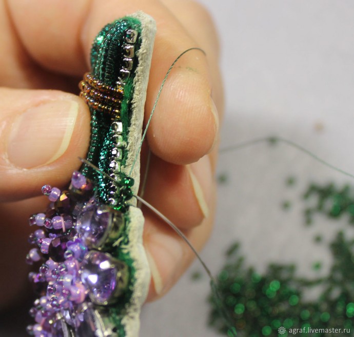Материалы: застёжка, мононить, стразы, кожа, пайетки, бисер, канитель.