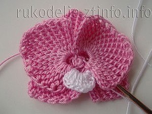 Теперь приступаем к вывязыванию верхних лепестков орхидеи. Принцип вязания такой же, меняется количество петель и рядов в лепестках. Для начала так же делаем арочки под лепестки. Вот здесь то и понадобятся передние стенки петелек, под них мы и будем крепить арки. Чтобы перейти к верхним лепесткам, делаем 2 воздушные петли и соединительной петлей цепляемся в половинку петли маленького круга.