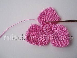 Затем вяжем 3 арки из 5 воздушных петель. Для этого вяжем 5 воздушных петель, пропускаем 3 петли предыдущего ряда и соединительной петлей цепляемся за 4-ю петлю предыдущего ряда повторить 3 раза. Теперь приступаем к вязанию нижних лепестков орхидеи. Для этого набираем 4 воздушные петли 1 воздушная петля подъема