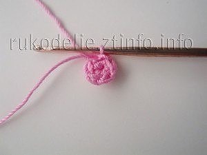 Вводим крючок в 2-ю воздушную петлю от крючка, захвачиваем нить, протягиваем ее и оставляем сделанную петлю на крючке (провязываем только под изнаночную полупетлю каждой воздушной петли). Вводим крючок в следующую воздушную петлю, захвачиваем нить, делаем петлю и оставляем ее на крючке.