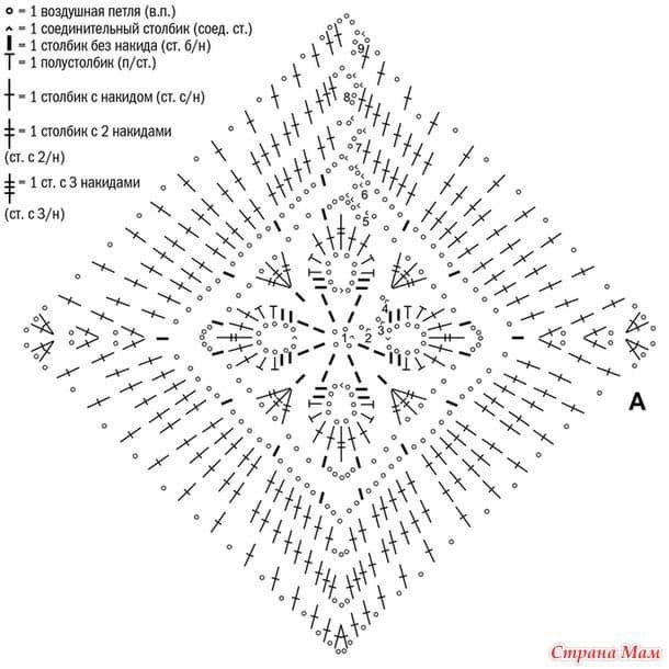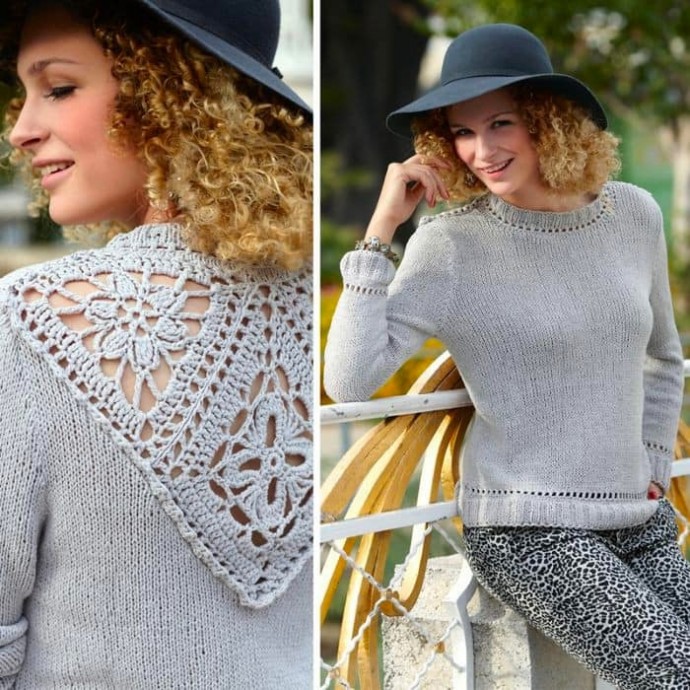 Изысканная спинка создается на основе двух видов мотивов: ромбовидного и треугольного, которые вместе создают большой ажурный треугольник на спине.