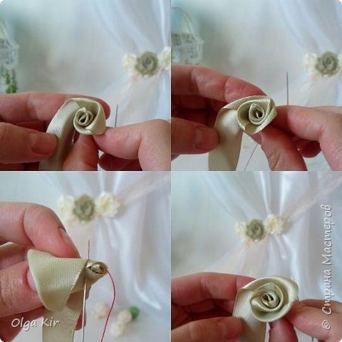 Эти розы из атласных лент похожи на прекрасные цветы, омытые утренней росой.