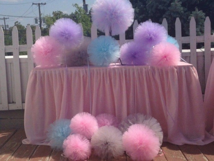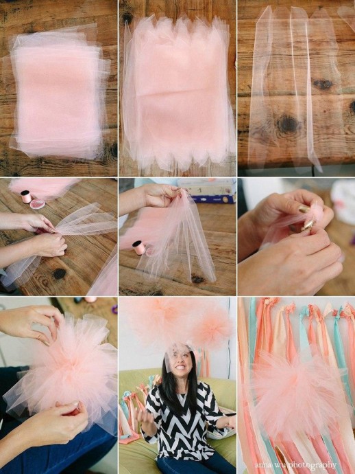 Праздничные помпоны для украшения зала можно делать из тюля или органзы или фатина.