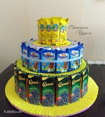 Торт из сладостейВ зависимости от того, какие вы выберете сладости для изготовления этого торта - таким и будет сфера его использования: от детского сада до девичника.