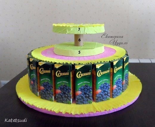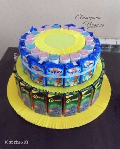 Торт из конфетГостинец можно оформить так, что будет выглядеть как очень дорогая вещь.