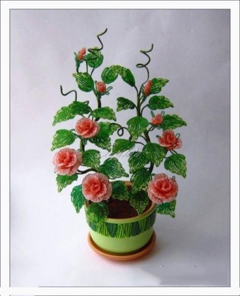 Кустовая роза из бисера даже лучше, чем обычное деревце бонсай, ведь она непрерывно цветет.