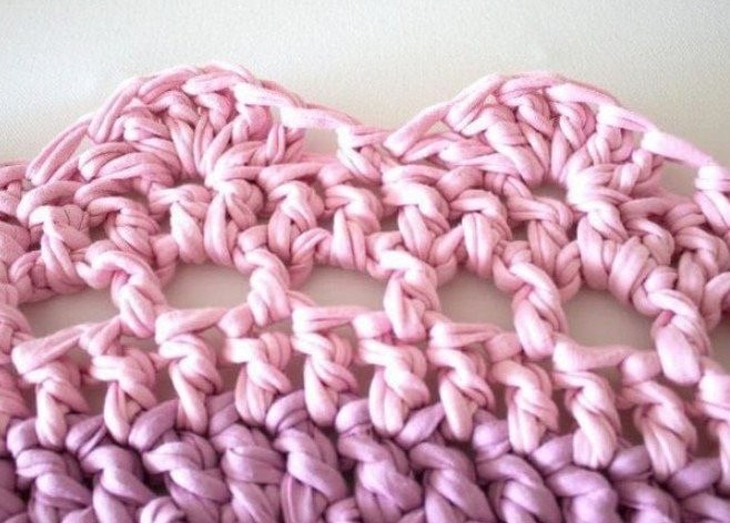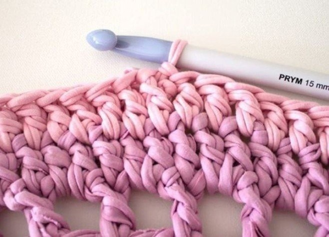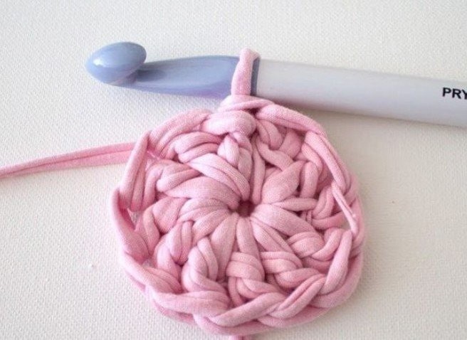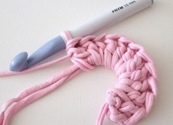 Вяжем крючком корзинку из трикотажной пряжиВ дальнейшем ее можно использовать для хранения мелких вещей.