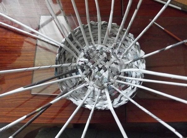 Плетение из газетных трубочекКак сплести овальное дно для корзинки подробно показано ниже.