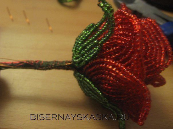 Роза из бисераЛепестки. Средний лепесток выполните из светло-розового бисера параллельным плетением по схеме: 13 (3 раза) — 12 (3 раза) — 11 (2 раза). Длина проволоки 7...