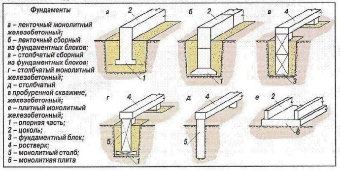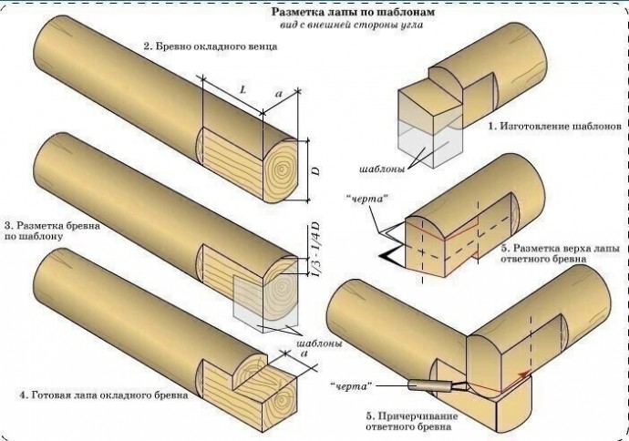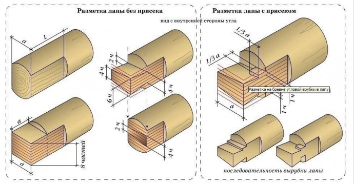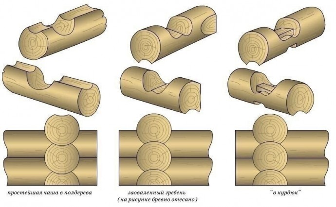 Строительство бани начинается с закладки фундамента. Дерево более легкий материал, чем кирпич, но на мягких глинистых и песчаных грунтах предпочтителен ленточный фундамент по всему периметру несущих стен. Если баня будет располагаться на склоне, то без свай не обойтись. На плотных грунтах и при небольшой расчетной массе здания можно ограничиться столбчатым фундаментом. Глубина закладки столбов определяется глубиной промерзания почвы. Для каждого региона этот показатель индивидуален, в среднем он составляет 70-100 см. На этапе строительства фундамента нужно позаботиться о системе отвода воды. Между готовым фундаментом и стенами укладывают гидроизоляционный материал. Стены начинают возводить с закладного венца. Для него выбирают самые толстые бревна. Вначале два бревна, распиленные до необходимой длины, укладывают на фундамент по параллельным сторонам. На них делаются вырубки-пазы для укладки бревен перпендикулярного ряда. Возвышение верхнего ряда над нижним должно составлять половину радиуса бревна. Аналогичным образом укладываются остальные ряды. На нижних бревнах вырубаются пазы, в которые укладываются верхние бревна. Различные варианты вырубки пазов представлены на рис. 1 (вырубка в чашу) и рис. 2 (вырубка в лапу).