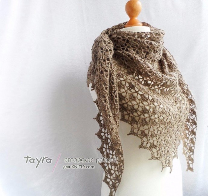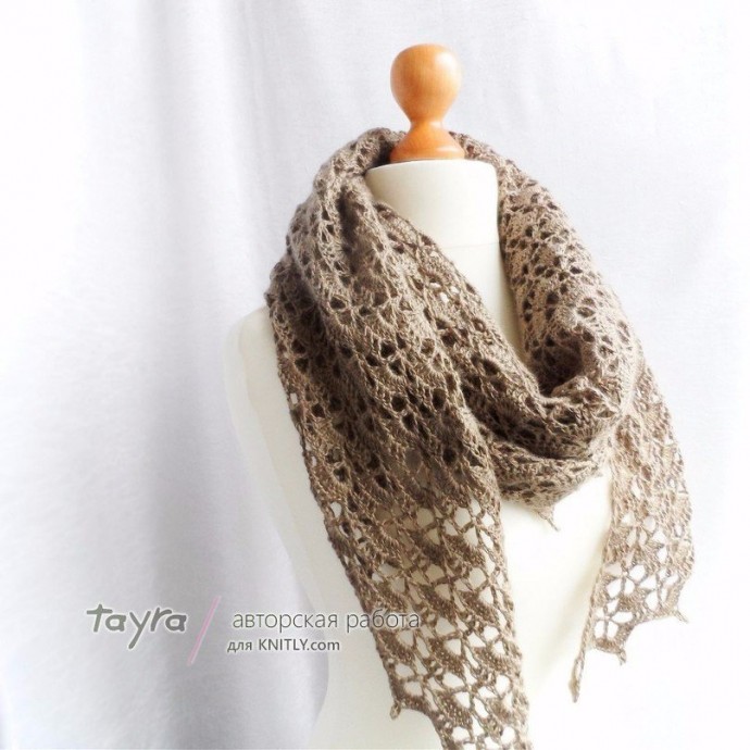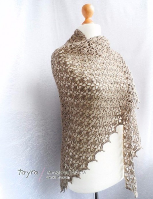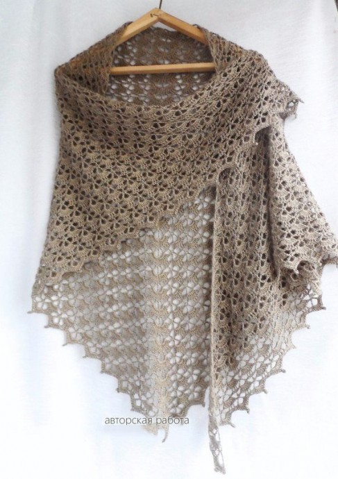 Серо-коричневый теплый цвет, мягкая мериносовая итальянская пряжа, ненавязчивый ажур, что еще нужно для оригинального женского аксессуара, такого как шаль.