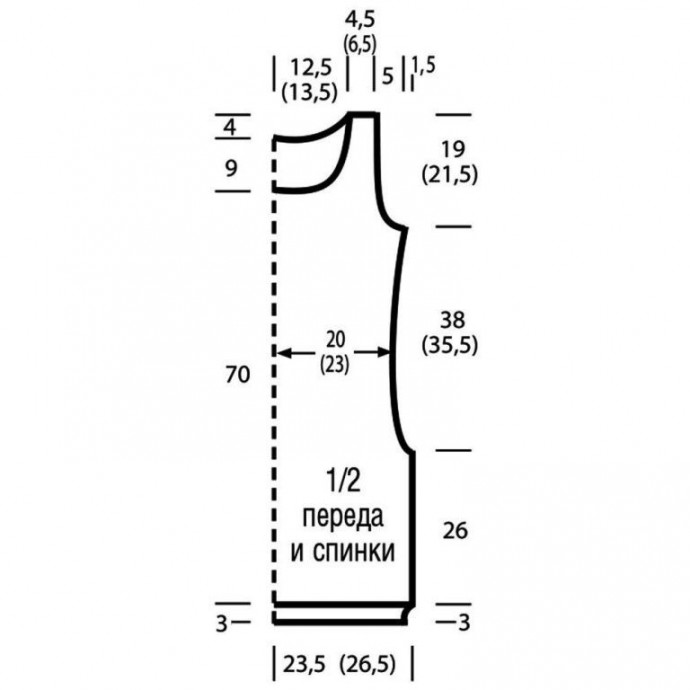 Набрать на спицы 86 (98) петель и для планки связать 3 см резинкой. Продолжить работу ажурным узором. Через 26 см = 56 рядов от планки закрыть для приталивания с обеих сторон 1 x 1 п., затем в каждом 8-м ряду 5 x 1 п. = 74 (86) п. Через 48,5 см = 104 ряда от планки вновь прибавить с обеих сторон 1 x 1 п., затем в каждом 12 (10-м) ряду 2 x 1 п. согл. узору = 80 (92) п. Через 64 см = 138 рядов (61,5 см = 132 ряда) от планки закрыть для пройм с обеих сторон 1 x 4 п., затем в каждом 2-м ряду 1 x 2 п. и 3 x 1 п. = 62 (74) п. Через 79 см = 170 рядов от планки закрыть для горловины средние 26 (30) п. и обе стороны закончить раздельно. Для скругления по внутреннему краю закрыть в каждом 2-м ряду 1 x 5 п., 1 x 3 п. и 1 x 2 п. Оставшиеся по 8 (12) п. плеч закрыть через 83 см = 178 рядов от планки.