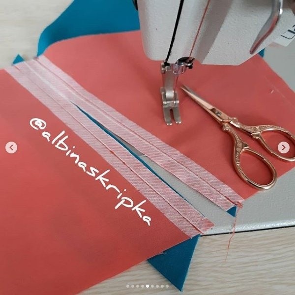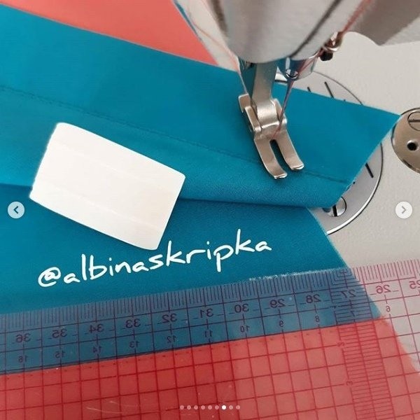 Нам понадобится: боковая деталь с намеченной линией входа в карман, центральная деталь, мешковина кармана со сгибом, продублированная деталь листочки со сгибом. Направление долевой нити на лицевой стороне листочки должно совпадать с направление долевой нити в юбке. На изнаночной стороне боковой детали юбки , параллельно линии входа в карман я приклеила две полоски нитепрошивного долевика. Чтобы нить долевика шла примерно там, где у меня будут проходить строчки. Линию входа в карман переносим на лицевую строну. Прикладываем листочку открытыми срезами к этой линии. С противоположной стороны притачиваем мешковину кармана. Расстояние между строчками у меня получилось 1.5 см. Разрезаем вход в карман посередине между строчками. К притаченной листочке притачиваем вторую сторону мешковины. Припуск настрачиваем на мешковину. Срезы припуска стачивания верхней части боковой детали и мешковины окантовываем и заутюживаем, застрачиваем наверх, так спрячется под припуском наш долевик. Отмечаем 1.5 см на верхней части кармана. С этими метками совмещаем шов притачивания листочки. Листочку прикалываем к верхней части боковой детали. Настрачиваем карман на нижнюю часть боковой детали. Строчить лучше обе стороны в одном направлении. Стачиваем боковую деталь с центральной деталью юбки. Срезы обрабатываем любимым способом.