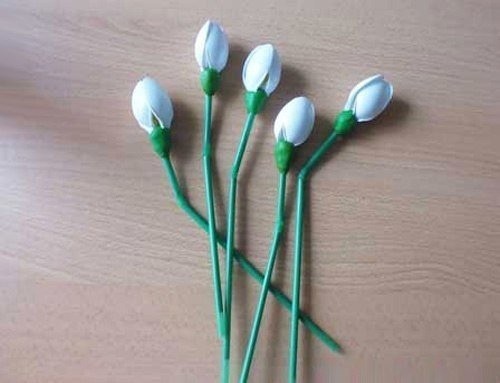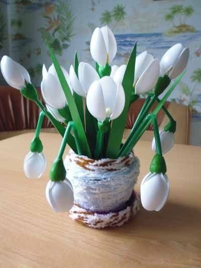 Вечные подснежники создаются из одноразовых пластиковых ложек, пластилина, коктейльных трубочек.