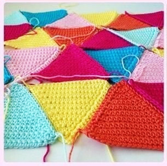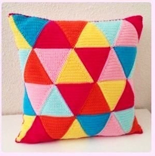 Вяжем подушку из треугольных мотивов, используя разноцветные остатки пряжи.