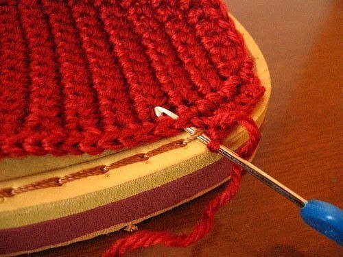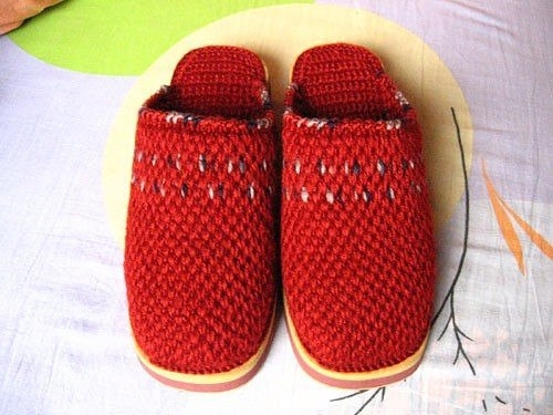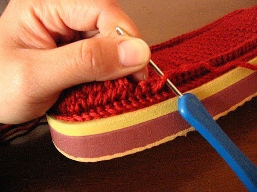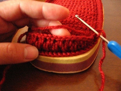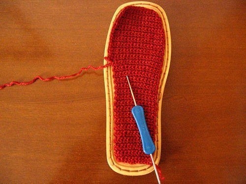 Если я правильно поняла идею - подошва пришивается к стельке, а потом начиная с мыска изделия вяжется верхняя часть, постепенно увеличивая число петель. А подошву можно сделать из туристического коврика или еще бывают подкладки под колени для работ в огороде.