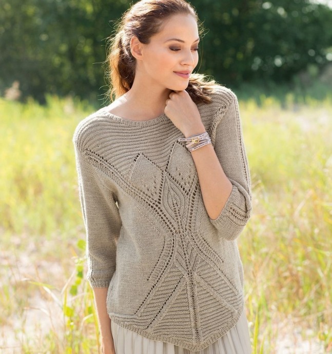 Сочетание поперечной резинки, диагональных ажурных полос и роскошных мотивов в виде листьев выглядит просто восхитительно.Размеры
