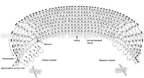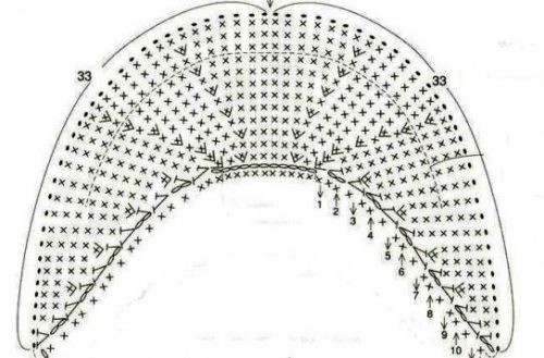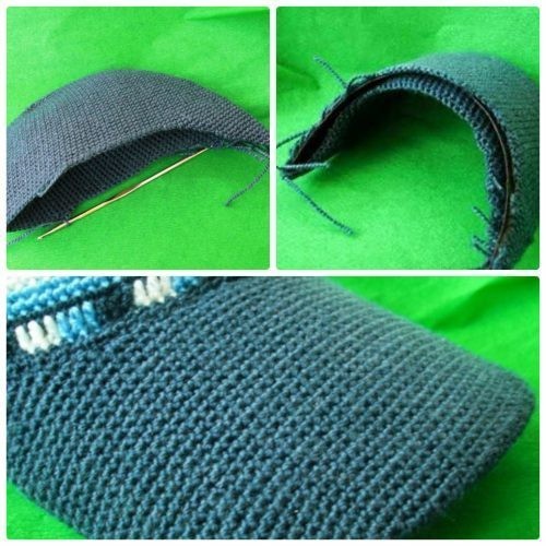 Деталей козырька нужно связать две, затем приколоть их булавками по бумажной разметке, отпарить через влажную ткань слабо нагретым утюгом. По краю отлета козырек следует сшить ручными стежками или соединить при помощи крючка.