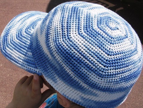 Аккуратно одеваем нашу кепку на мячик, выравниваем козырек, и пришиваем его к основанию. Наша связанная кепка крючком столбиками без накида готова.