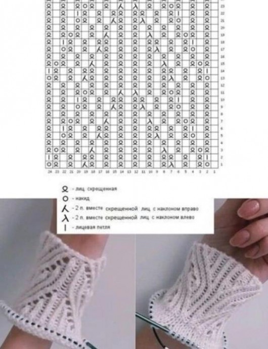 Вяжем митенкиПлотность вязания: 25 п = 10 смАжурный узор Штриховка:Ряд 1: * 3 лиц, 2 вместе лиц, накид, 1 лиц, повторять от * Ряд 2: * 2 лиц, 2 вместе лиц, накид, 2 лиц, повторять ...