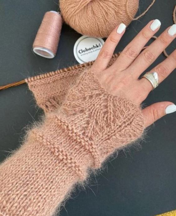 Вязаные митенкиЧтобы это стало митенками - перехватите, соединяя между пальцев.Хотя так можно и просто оформить низ рукава.Творите красоту и будьте счастливы.