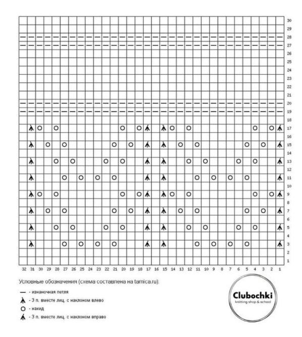Плотность вязания: 25 п = 10 см Ажурный узор Штриховка: Ряд 1: * 3 лиц, 2 вместе лиц, накид, 1 лиц, повторять от * Ряд 2: * 2 лиц, 2 вместе лиц, накид, 2 лиц, повторять от * Ря...