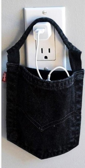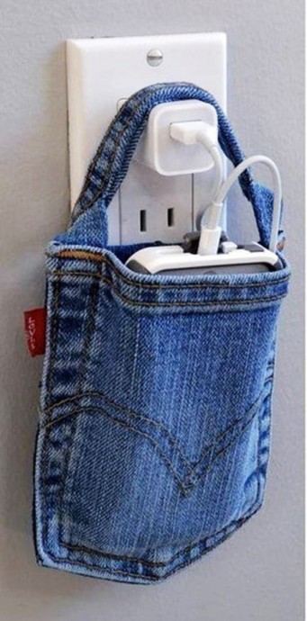 Вторая жизнь старых джинсов может реализоваться как удобные кармашки для зарядки телефонов, например.