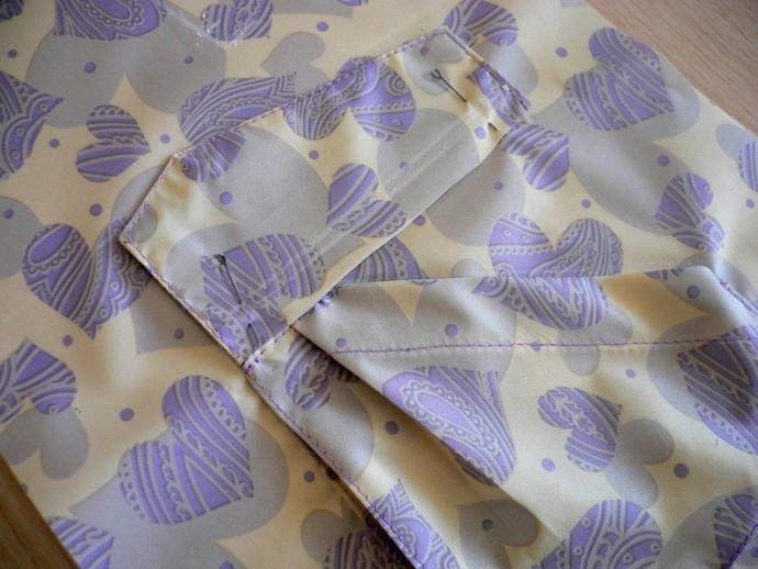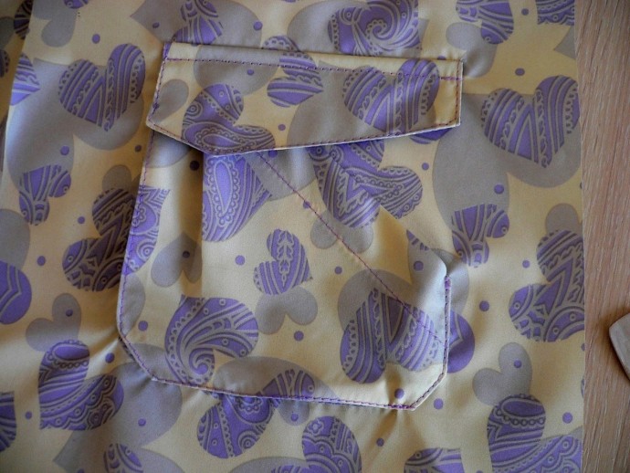 Наметила карман, обвела и пришила, подогнув 1 см, сначала нижнюю часть, потом закрепки по верху и по боку кармана.