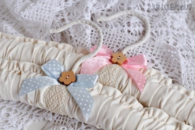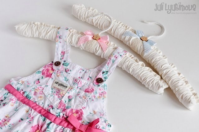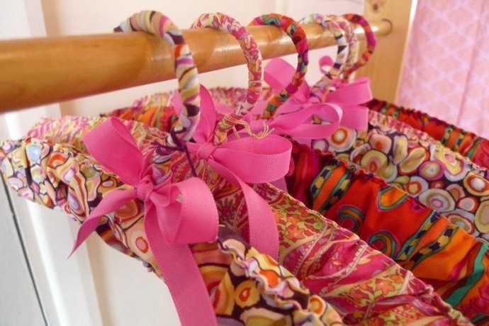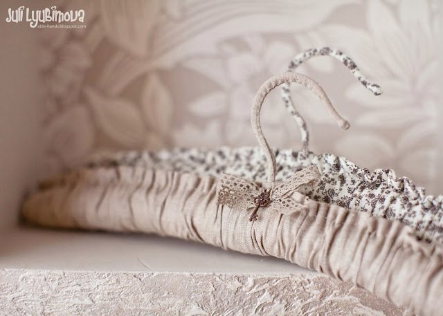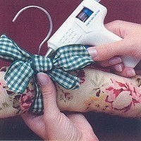 6. Повяжите поверх шва ленту, чтобы скрыть стежки. Другую ленту завяжите бантиком и с помощью клеевого пистолета приклейте к верху плечиков. Полезный подарок сделанный своими руками готов.