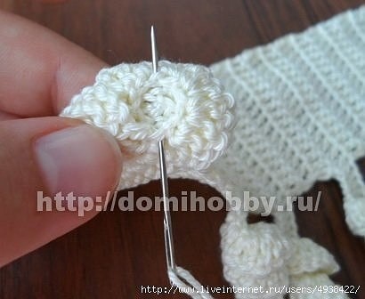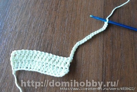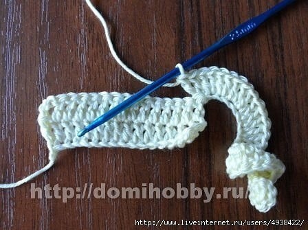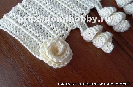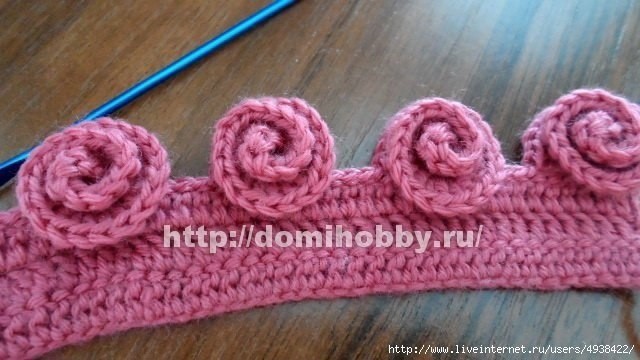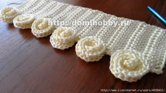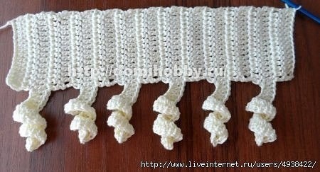 Наберите начальную цепочку петель нужной длины и вяжите ряды ст. с/н. Завершив 2-й ряд столбиков, наберите с боковой стороны цепочку из 20 воздушных петель для вязания спиральки. Начиная с 4-й петли от крючка вяжите по набранной цепочке по 2 ст. с/н из каждой петли, из-за удвоенного количества столбиков связанная полоска будет скручиваться в спираль. Связав спиральку, дальше вяжите ряд столбиков. *Через 4 ряда столбиков, вновь наберите цепочку из 20 возд. петель, обратно по цепочке с 4-й петли от крючка вяжите по 2 ст с/н из одной петли, повторяйте от * на необходимую высоту. Полученную кайму со спиральками формируем в розочки, для этого каждую спиральку закрутите в розочку и сшейте ее основание с изнанки.