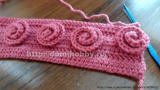 Можно вязать розочки по ряду столбиков. Для этого по ряду провяжите 3 соединительных столбика, затем для вязания спирали наберите цепочку из 20 возд.п. По цепочке петель вяжите, отступив 3 петли от крючка, по 2 ст с/н из одной петли, всего 34 столбика, закрепите спираль соединительным столбиком пропустив от начала спирали 2 петли. Затем выполните еще 6 соединительных столбика по ряду и вновь набирайте цепочку из 20 возд. петель для вязания следующей спирали. Из связанных спиралей по ряду сформируйте розочки и закрепите их ниткой с иголкой с изнаночной стороны. Далее вяжите полотно столбиками по ряду соединительных столбиков, а за розочками по петлям предыдущего ряда, тогда розочки будут находится на связанном полотне.