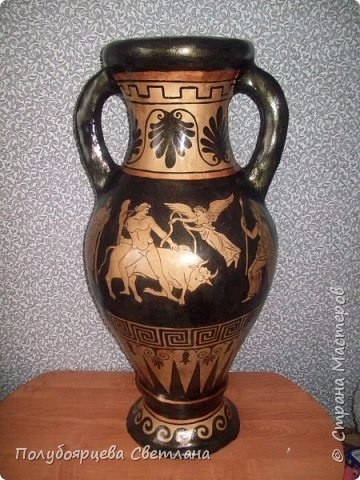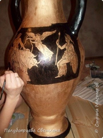 Наносим рисунок на вазу и раскрашиваем. Но прежде чем наносить рисунок нужно предварительно сделать эскиз вазы, чтобы продумать какая должна быть ваза и как она будет выглядеть. Я взяла два подвига Геракла: «Критский бык» и «Битва с королевой Амазонок» (очень понравились эти рисунки). Картинки срисованы с древнегреческой вазы. При нанесении орнамента я делала трафарет, чтобы узор был ровный, обводила карандашом и раскрашивала тонкой кисточкой.