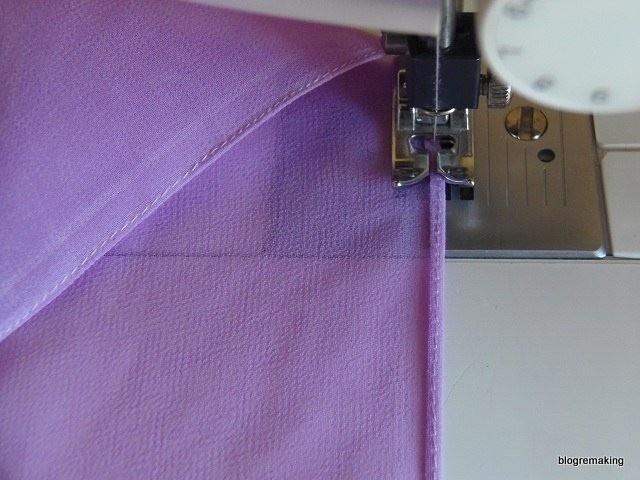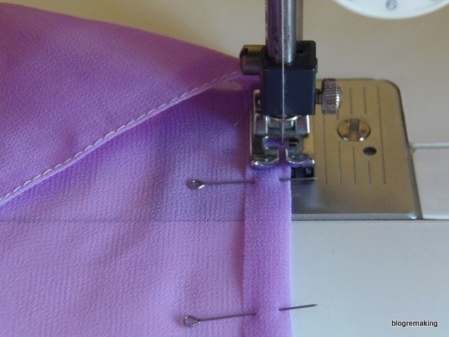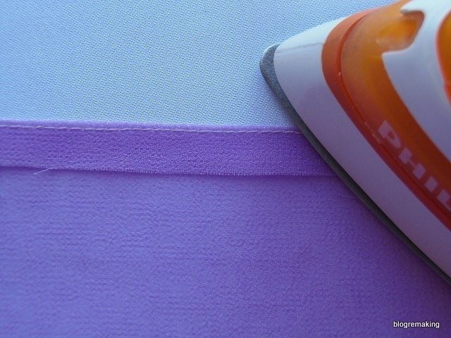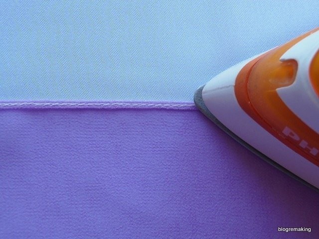 Для обработки края этим способом необходимая величина припуска должна составлять 1-1,3см. Подвернем на изнаночную сторону припуск шириной 0,7-1см и проложим строчку отступая от сгиба ткани 1мм. Строчку нужно прокладывать очень ровно.