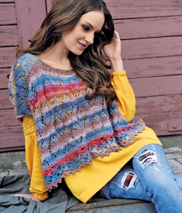 Пряжа (45% шелка, 45% мохера, 10% шерсти; 125 м/50 г) — 350 (400) г меланжевой бежево-розово-зелено-бирюзовой; спицы №6; крючок №4.