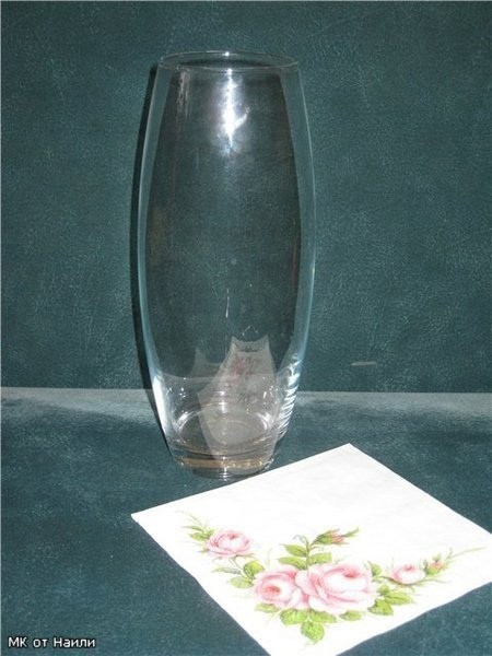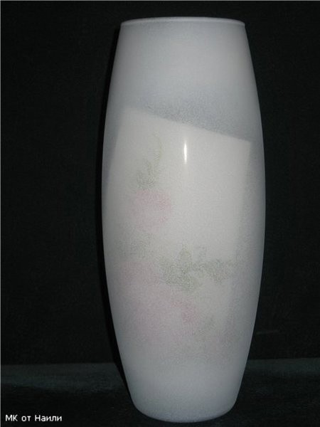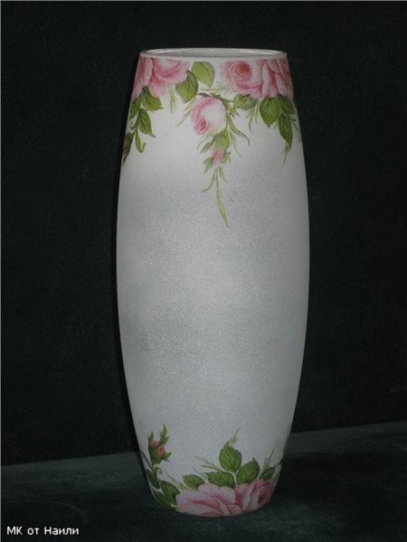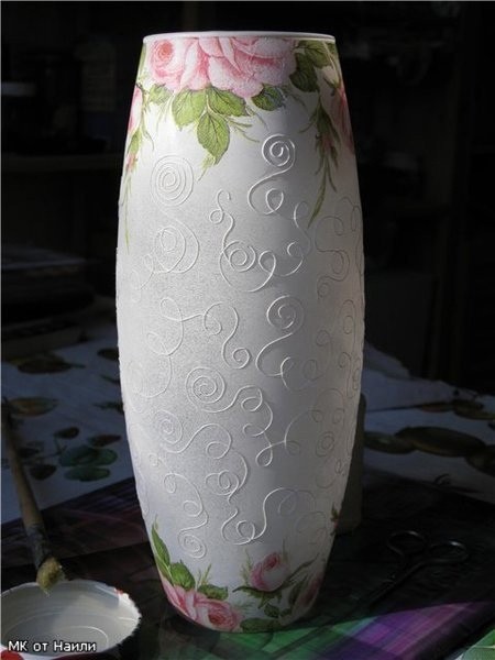 Декор вазы выполняется в технике декупажа и сверху стекла наносится объёмный узор.
