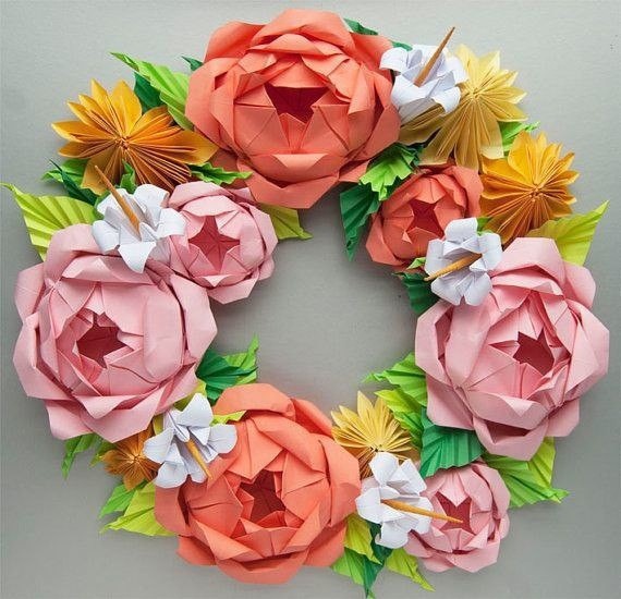Венок из бумажных цветов украсит праздничный стол, сделав обстановку приятнее.