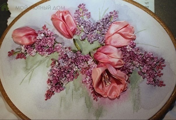 вышивка лентами: сирень и тюльпаны
