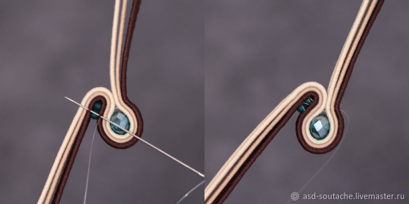Проходим вокруг бусины несколькими стежками, закрепляя между собой слои сутажа.