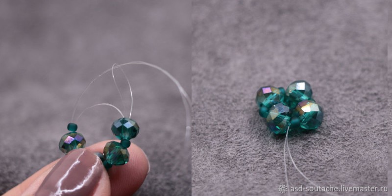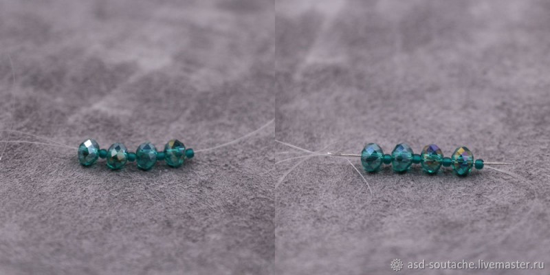 Набираем на нить поочередно 4 бирюзовых бусины 6 мм и 4 бисерины 11/0. И проходим иглой еще раз в том же направлении, начиная с первой набранной бусины.