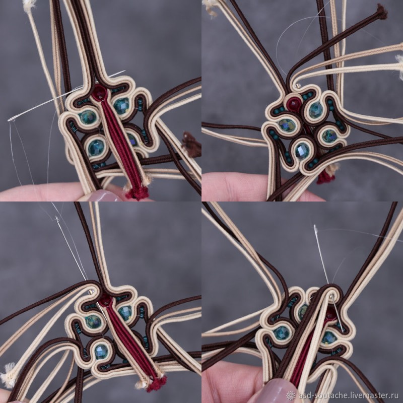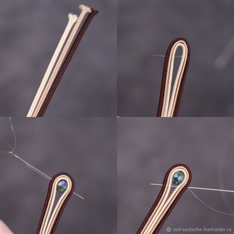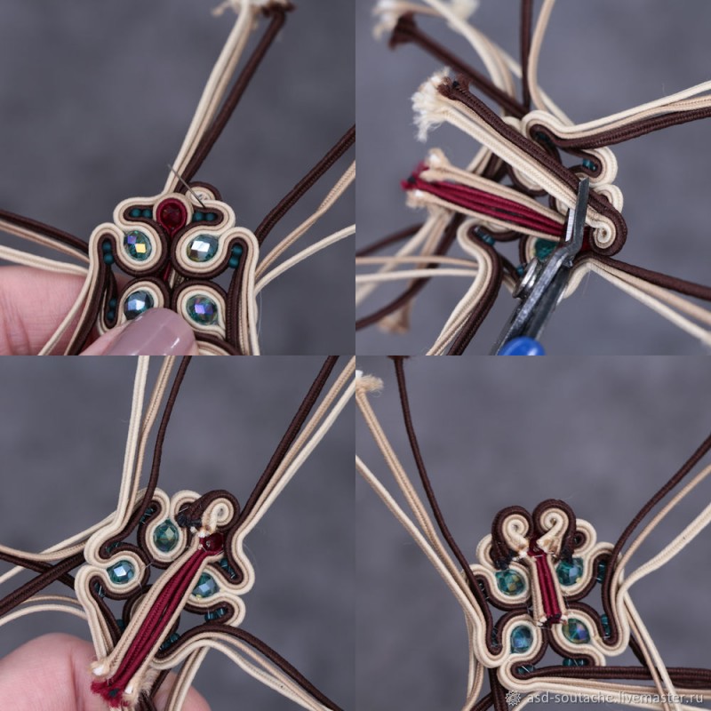 Отдохнули? Отлично. Основные моменты уже описаны, поэтому несколько следующих действий без комментариев — по фото. Единственное замечание, сутаж снова отрезаем с запасом — на коричневую бусину (4мм) и внешний край отрезки по 7 см.