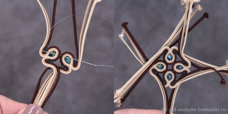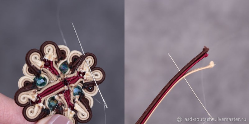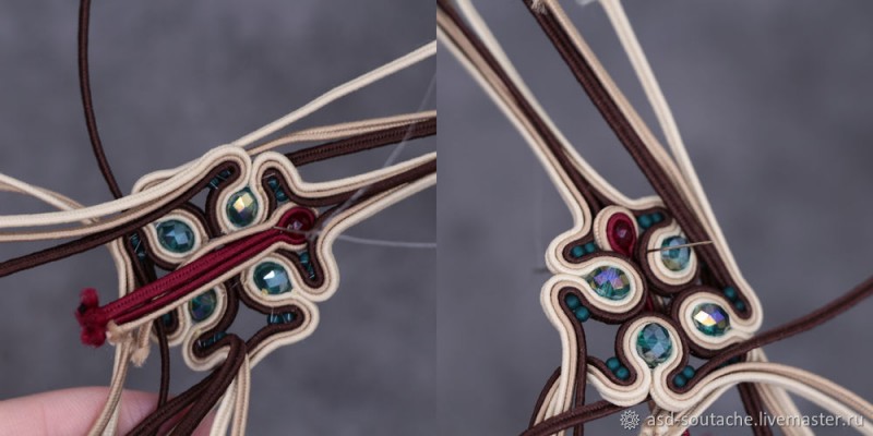 Закрепляем боковые концы сутажа, ровняем с изнанки бисерный ряд. Выходим в центр и формируем завитки.
