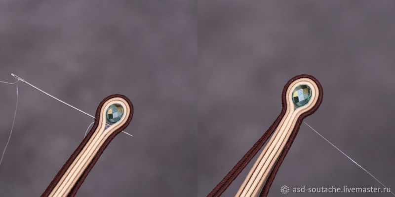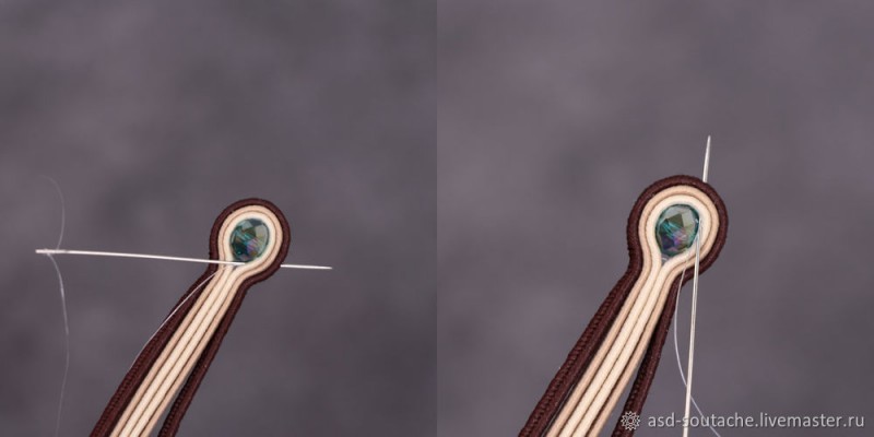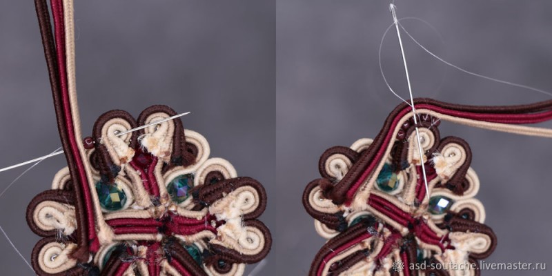 Далее проходим иглой 3-4 раза через все слои сутажа, не затягивая. Теперь плотно зажимаем сутаж пальцами в месте прохода нити и затягиваем ее. Таким образом у нас получится не перетянутое и ровное соединение, и не порвется нить, что часто бывает в работе с жестким сутажом.