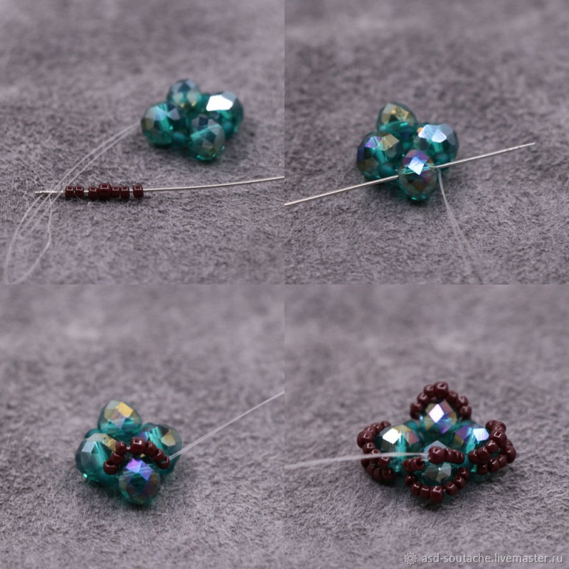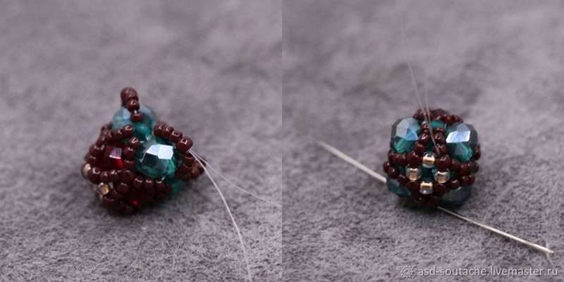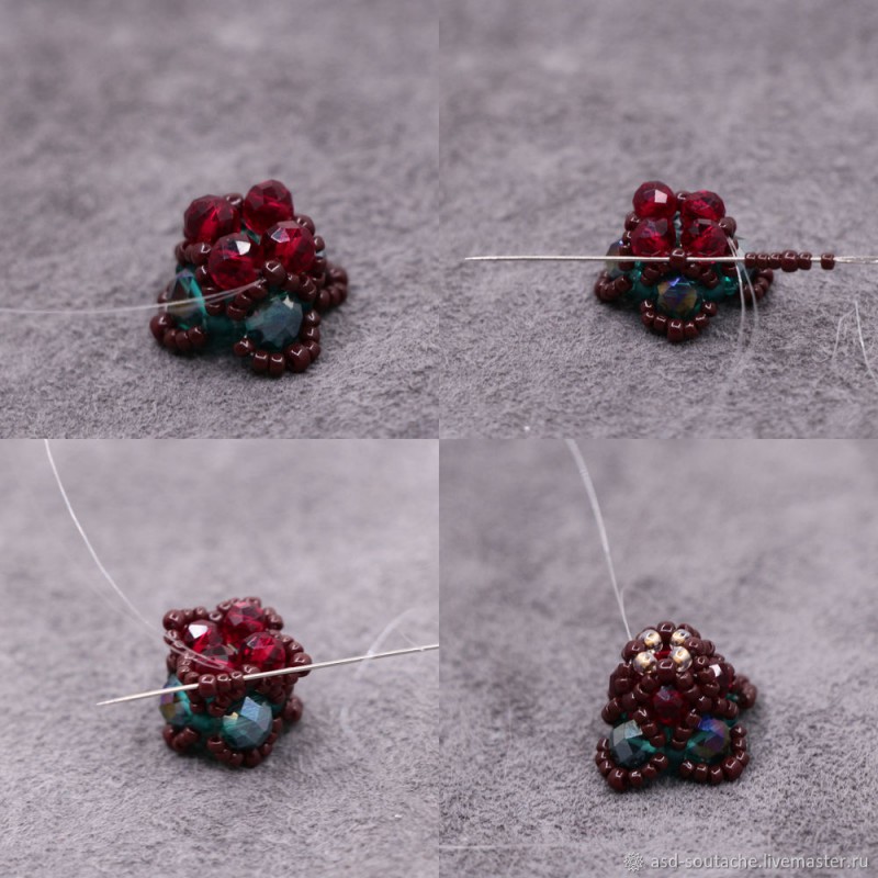 Проходим иглой по рисунку через бисер и бусины, выводим иглу в центральную бисерину нижней арки. Собираем все 4 арки через золотой бисер. Проходим по кругу на второй раз, стягиваем. Закрепляем нить — проходим через бусины и бисер по рисунку, «запутывая» ее. Обрезаем.