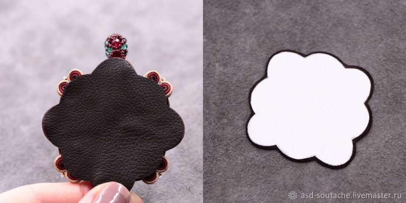 Заготовка для оформления изнанки готова. Наносим клей на картон, стараемся не заходить на кожу. Прикладываем к кулону, совмещая контуры, фиксируем. Далее край кожи крепим к кулону любым привычным и удобным способом.