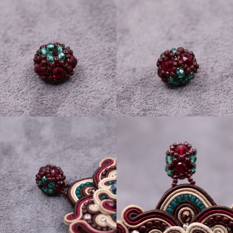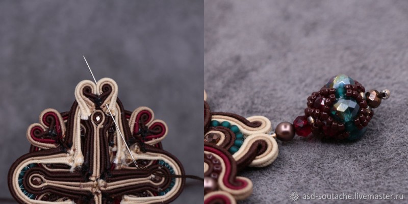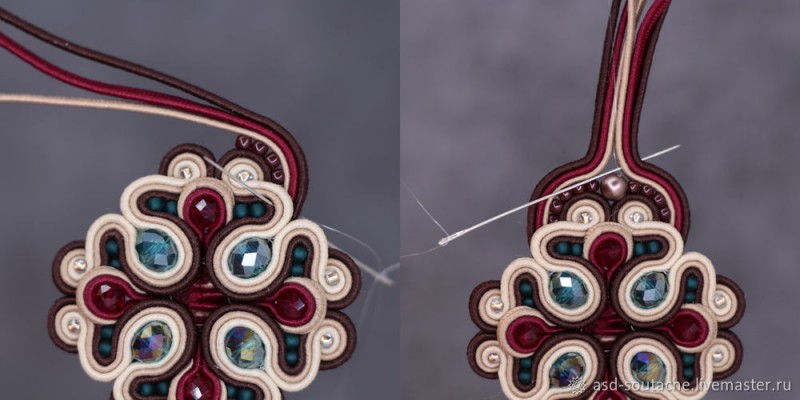 Повторяем с другой стороны. Концы сутажа от красной бусины обрезаем и подплавляем, как показано на фото. Сутаж должен перекрыть середину.