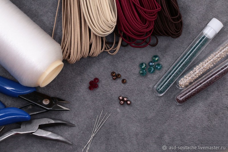 Сутаж 4 цветов; граненые бусины рондели 2,4 и 6 мм; жемчуг Swarovski 4 мм; бисер Toho 11/0 и 15/0; небольшой отрезок натуральной кожи; бисерные иглы (несколько штук, с запасом); мононить 0,13 и 0,15;тонкогубцы; бокорезы; клей Момент кристалл.